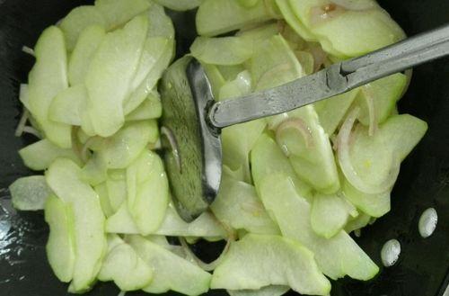 将佛手瓜洗净切片,锅中加入适量油,放入蒜末爆香,再加入佛手瓜片翻炒至断生,最后加入适量盐、鸡精调味即可。